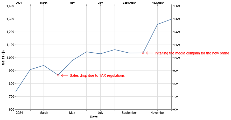 In: # تصوير البيانات chart = pn.Story(sales_data).mark_line().encode( x=alt.X('Date:T', title='Date', axis=alt.Axis(labelFontSize=12, titleFontSize=14)), y=alt.Y('Sales:Q', title='Sales ($)', scale=alt.Scale(domain=[600, sales_data['Sales'].max() + 50]), axis=alt.Axis(labelFontSize=12, titleFontSize=14)) ) # إضافة السرد القصصي filtered_sales_data = sales_data[sales_data['Note'].notna()] for i in filtered_sales_data.index: chart = chart.add_annotation( filtered_sales_data['Date'][i], filtered_sales_data['Sales'][i], filtered_sales_data['Note'][i], arrow_direction='left', arrow_dx=25, arrow_dy=-1, arrow_color='red', arrow_size=30, label_color='red', label_dx=45, label_dy=-5, label_size=14, show_point=True ) chart.render()